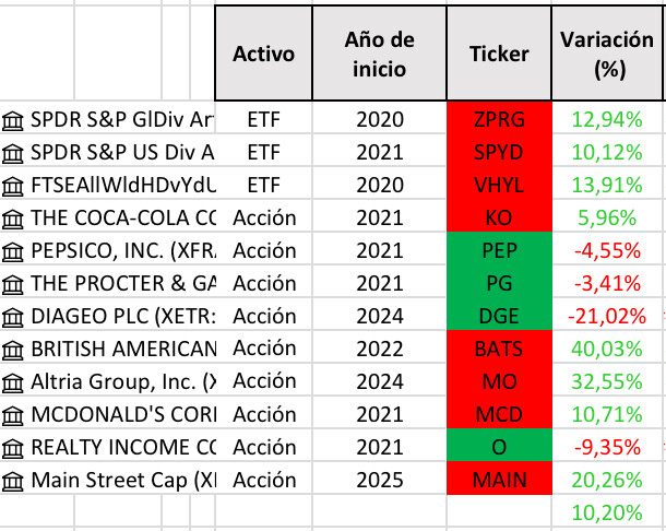 Top 3 subidas: +9,08% MCD, + 6,92% PEP y +6% SBUX. Top 3 por abajo: -4,1% ZPRG, -2,1% SPYD y -2,07% VHYL