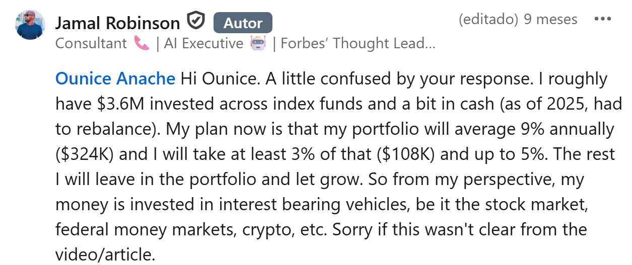 Robinson currently has $3.6 million in his brokerage and checking accounts and revised his payment upwards to roughly 5%, meaning he’ll allocate at most $185,000 this year, or roughly $15,400 per month. However, he typically spends much less than that, around $9,000 to $12,000 per month.