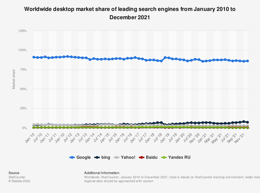 Lleva mas de una decada con mas del 80% de cuota de mercado en busquedas de internet y eso teniendo en cuenta que esta fuera del mercado chino y limitado en Rusia.