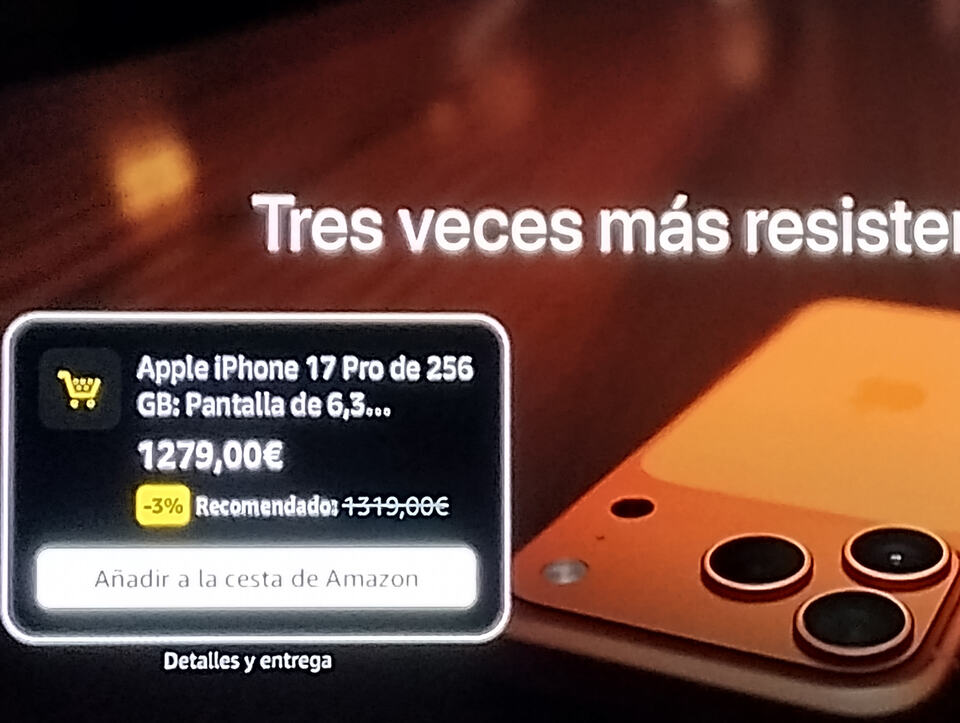 Hace unos días que estoy viendo esto: Amazon va un paso más y en la publicidad de prime video incluye anuncios cuyo producto puedes meter directamente en la cesta de compra. Esta es una foto que hice ayer viendo Fallout en la tele: