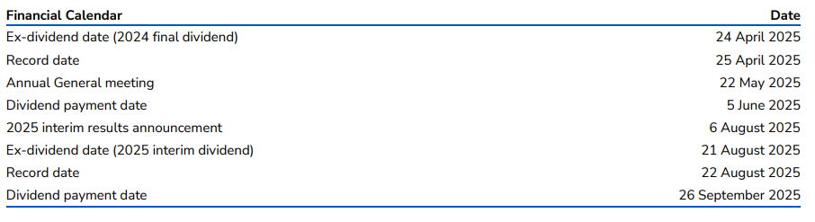The Board of Directors recommends a final 2024 dividend of 121.7 pence (2023: 115.9 pence). The ex-dividend date will be 10 April 2025 and the dividend will be paid on 29 May 2025 to shareholders on the register at the record date of 11 April 2025. The final 2024 dividend will be accrued once approved by shareholders.