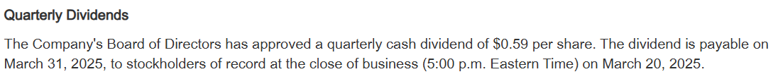 Broadcom, $AVGO, anunció anteayer que pagará su próximo dividendo trimestral, de 0,59$/acc., el día 31 de marzo de 2025.