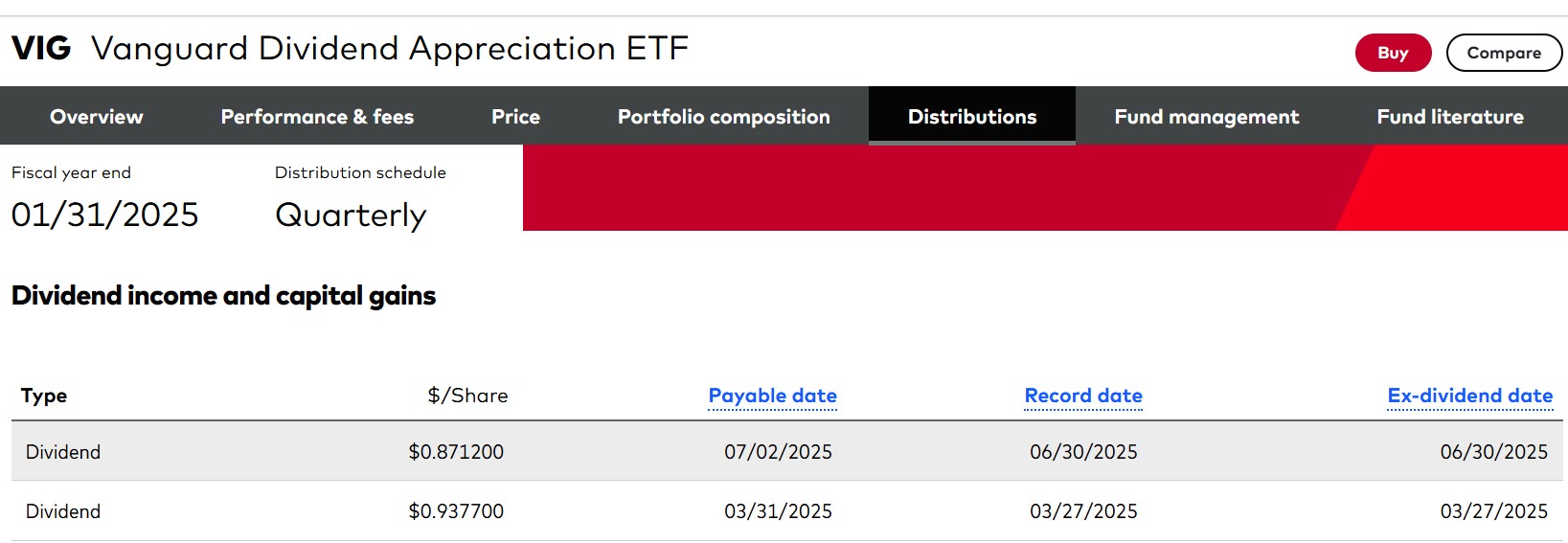 El ETF Vanguard Dividend Appreciation, $VIG , anuncia hoy que el día 02 de julio de 2025 pagará un dividendo de 0,8712$/acc.