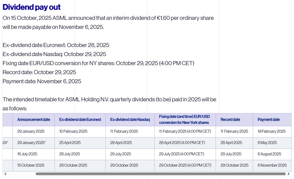 ASML, $ASML.AS, anuncia hoy que pagará su próximo dividendo a cuenta trimestral, de 1,60€/acc., el día 6 de noviembre de 2025.