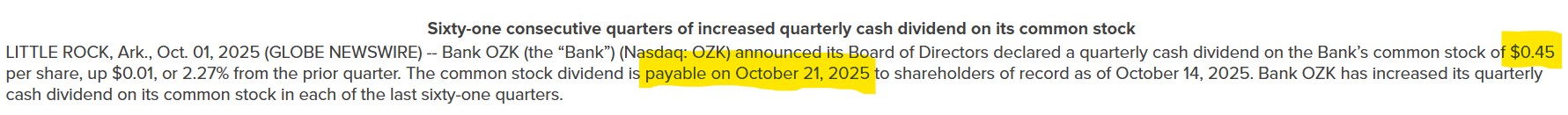 “Bank OZK aumenta dividendo trimestral por 61 trimestre consecutivo”