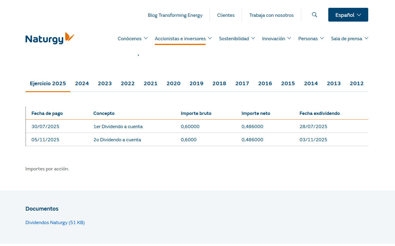 El segundo dividendo a cuenta de 2025, de 0,60 €/acción, se pagará el 5 de noviembre, en línea con un DPA total mínimo de 1,70 €/acción en 2025. Como parte del Plan Estratégico 2025-27, Naturgy revisó su política de dividendos estableciendo una trayectoria anual de dividendo por acción que pasa de un mínimo 1,70€ en 2025 a 1,80€ en 2026 y 1,90€ en 2027, sujeta al mantenimiento de una calificación crediticia BBB. El dividendo por acción final se incrementará de manera proporcional al tamaño de la autocartera a final de cada año, dado que las acciones en autocartera no cobran dividendo y el importe correspondiente es redistribuido entre el resto