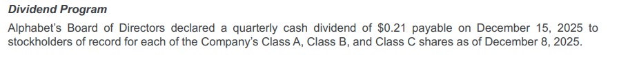 Alphabet, $GOOG, $GOOGL, anunció ayer que pagará su próximo dividendo trimestral, de 0,21$/acc., el día 15 de diciembre de 2025.