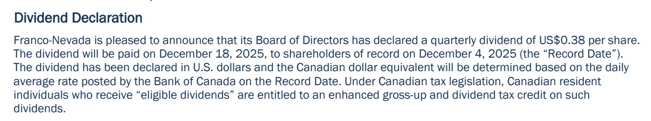 Franco Nevada, $FNV , anuncia hoy que pagará su próximo dividendo trimestral, de 0,38$ /acc., el día 18 de dciembre de 2025 .