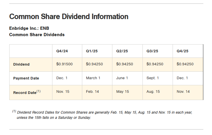 No encuentro la nota oficial pero veo en la web que Enbridge Inc TSE: ENB anuncia la fecha y el próximo pago, lo habitual, CAD$0.94250 el 1 de diciembre .