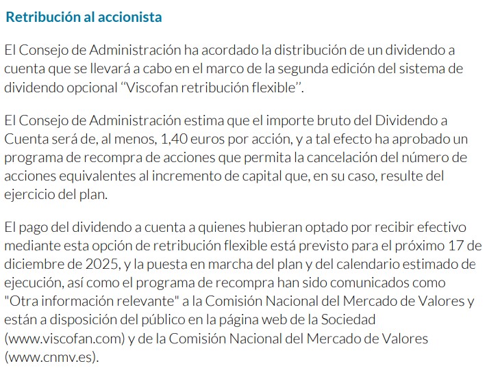Viscofan, $VIS .MC, anunció en su presentación de resultados del pasado 23 de octubre que el próximo 17 de diciembre pagará un dividendo a cuenta de 1,40€ /acc.