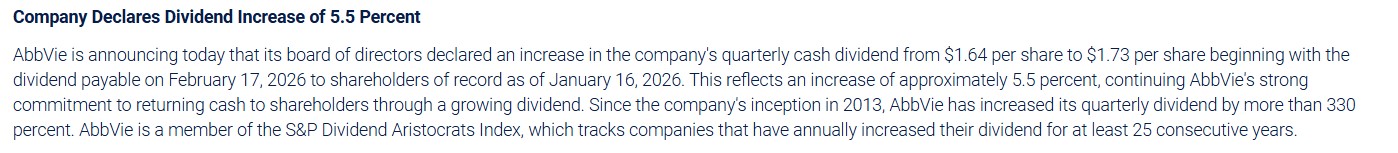 AbbVie, $ABBV , anuncia hoy que pagará su próximo dividendo trimestral el día 17 de febrero de 2026 , y que será de 1,73$ /acc., lo que supone un incremento del 5,49% respecto a los 1,64$ que ha abonado en sus pagos trimestrales de 2025.