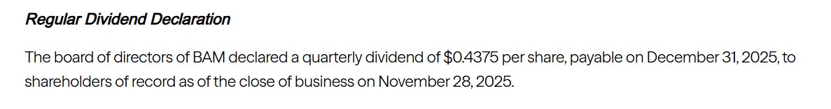 Brookfield Asset Management, $BAM, anuncia hoy que pagará su próximo dividendo trimestral, de 0,4375$/acc., el día 31 de diciembre de 2025.