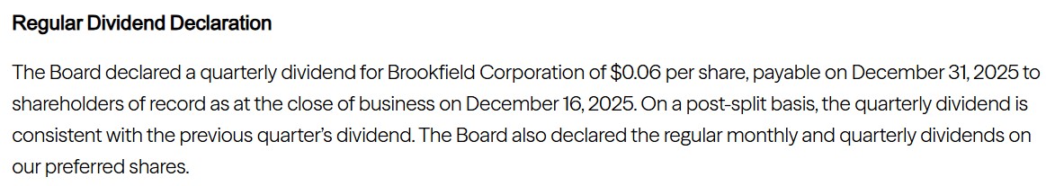 Brookfield Corporation, $BN, anuncia hoy que pagará su próximo dividendo trimestral, de 0,06$/acc., el día 31 de diciembre de 2025 (equivale a los 0,09$ que pagaba antes del split 5x2 que realizó el mes pasado).