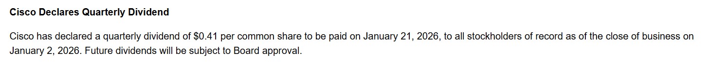 Cisco Systems, $CSCO , anunció ayer que pagará su próximo dividendo trimestral, de 0,41$ /acc., el día 21 de enero de 2026.