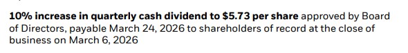 BlackRock, $BLK , anuncia hoy que pagará su próximo dividendo trimestral el día 24 de marzo de 2026 , y que será de 5,73$ /acc., lo que supone un incremento del 9,98% respecto a los 5,21$ que ha abonado en sus pagos trimestrales de 2025.
