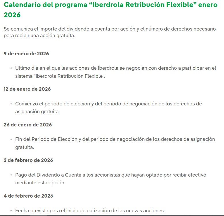 Iberdrola, $IBE .MC, anuncia hoy que pagará un dividendo a cuenta del ejercicio 2025 el día 2 de febrero de 2026 , y que será de 0,253€ /acc., lo que supone un incremento del 9,52% respecto a los 0,231€ que pagó hace un año como dividendo a cuenta de 2024. Según su sistema de retribución flexible, la opción por defecto será recibir una acción nueva gratuita por cada 73 derechos.