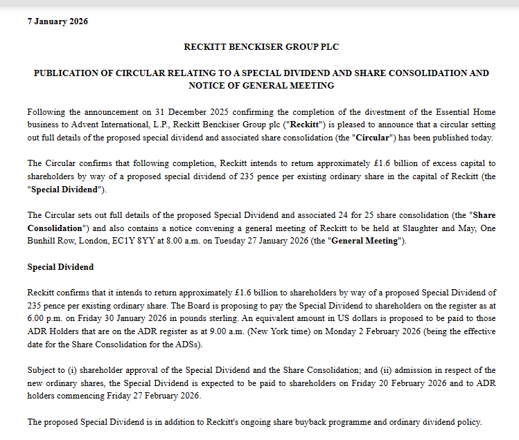 Reckitt Benckiser** LON: RKT anunció el pasado miércoles un dividendo especial de 235 pence para el próximo 20 de febrero de 2026 .