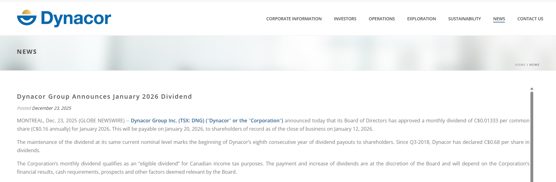 Dynacor Group Inc TSE: DNG declara su dividendo mensual de C$0.01333 para el próximo 20 de enero de 2026.