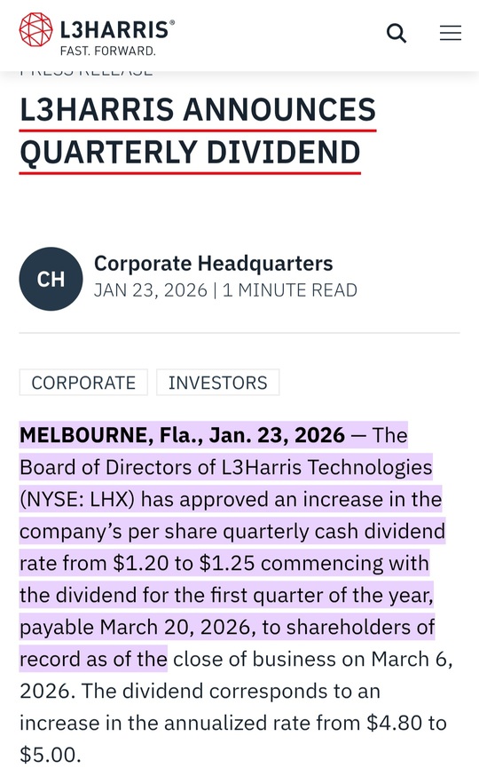 Chevron, $CVX, anuncia hoy que pagará su próximo dividendo trimestral el día 10 de marzo de 2026, y que será de 1,78$/acc., lo que supone un incremento del 4,09% respecto a los 1,71$ que abonó en sus pagos trimestrales de 2025.
