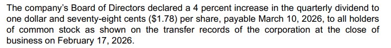 WEC Energy Group, $WEC, confirma hoy de forma oficial el dividendo que el mes pasado anunció tener intención de subir (+6,72%), a pagar el 1 de marzo de 2026 por un importe de 0,9525$/acc.