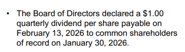 Morgan Stanley, $MS, anunció ayer que pagará su próximo dividendo trimestral, de 1$/acc., el día 13 de febrero de 2026.
