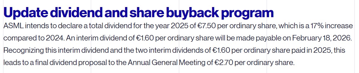 ASML, $ASML.AS. anuncia hoy que su dividendo total para el ejercicio 2025 será de 7,50€/acc., lo que supone un incremento del 17,19% respecto a los 6,4€ totales pagados con cargo a 2024. El próximo dividendo a cuenta de 2025, de 1,60€, se pagará el próximo día 18 de febrero, y el dividendo final, de 2,70€, se abonará el día 5 de mayo de 2026.