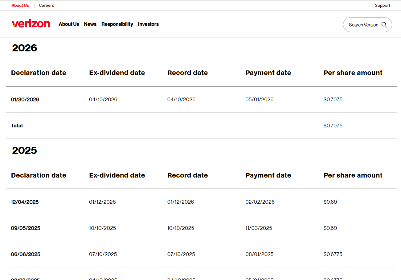 Verizon Communications NYSE: VZ anuncia un nuevo incremento de dividendo, el anterior fue hace dos trimestres, hasta los $0.7075 brutos por acción que pagará el próximo 1 de mayo de 2026.