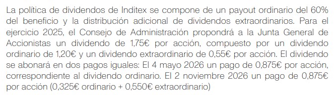 Inditex, $ITX.MC, anuncia hoy que propondrá a la JGA un dividendo de 1,75€/acc., lo que supone un incremento del 4,17% respecto a los 1,68€ que pagó en 2025. El dividendo se distribuirá en dos pagos iguales de 0,875€/acc. cada uno, los días 4 de mayo y 2 de noviembre de 2026.