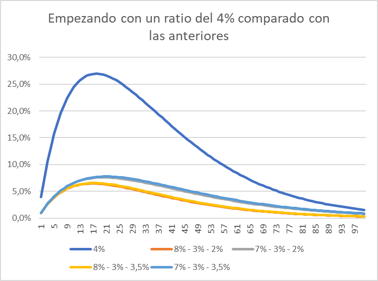 Grafica de ratio de deuda si empiezas con un préstamo del 4% comparado con los anteriores (condiciones 8% - 3% - 2%, el menos peligroso)