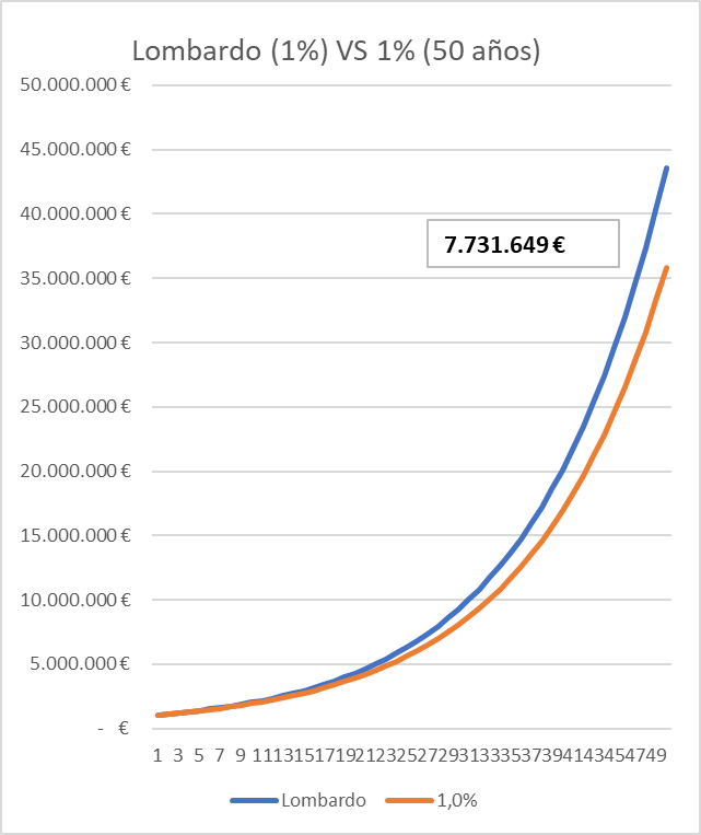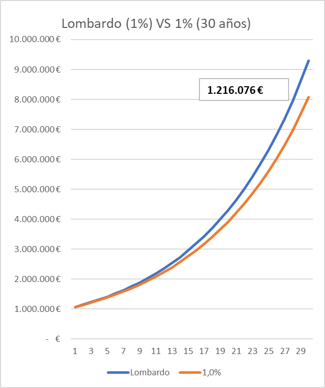 En 30 años ya estás obteniendo mas de un 100% ( 1.216.076 € ) de lo inicial de ventaja.