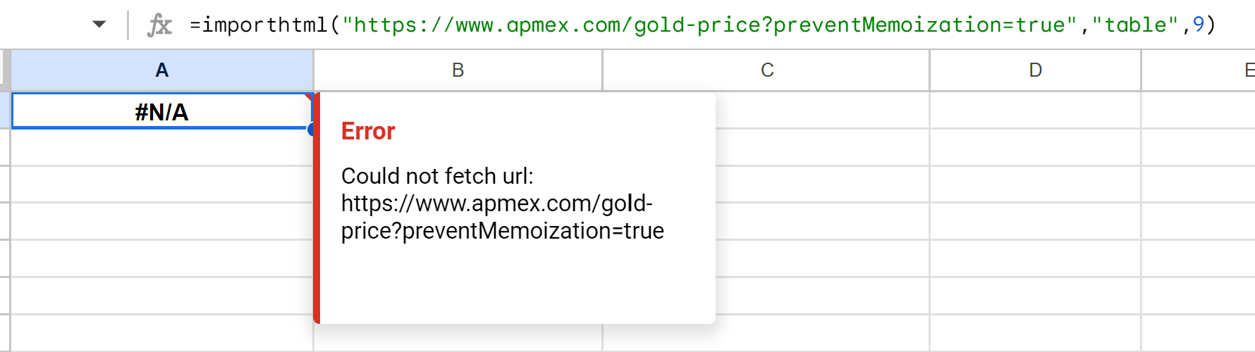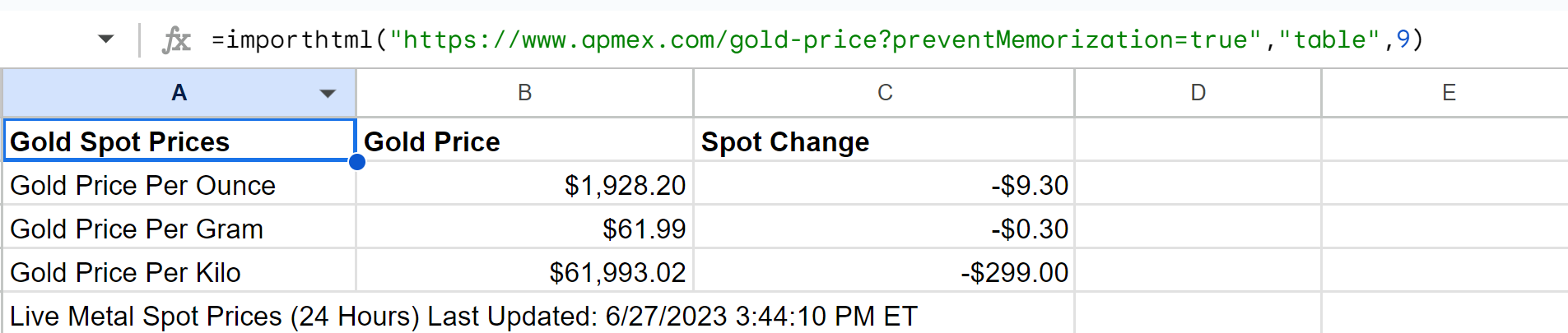 var fetchedData = '=ImportHTML("https://www.apmex.com/gold-price?preventMemoization=true"; "table"; 9)';