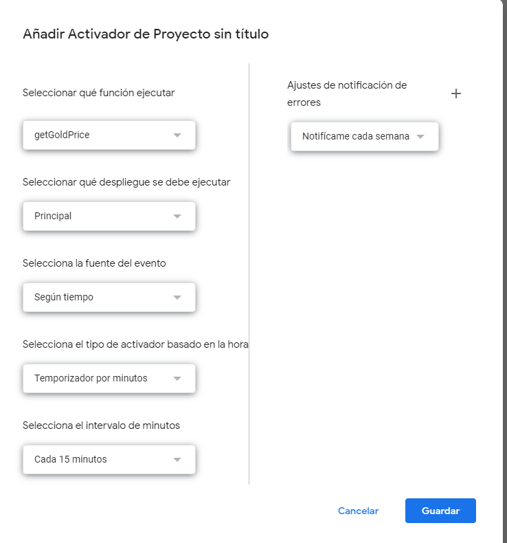 En la misma página de Apps script añades un activador nuevo, seleccionas la fórmula y eliges el tiempo de refresco a tu gusto:
