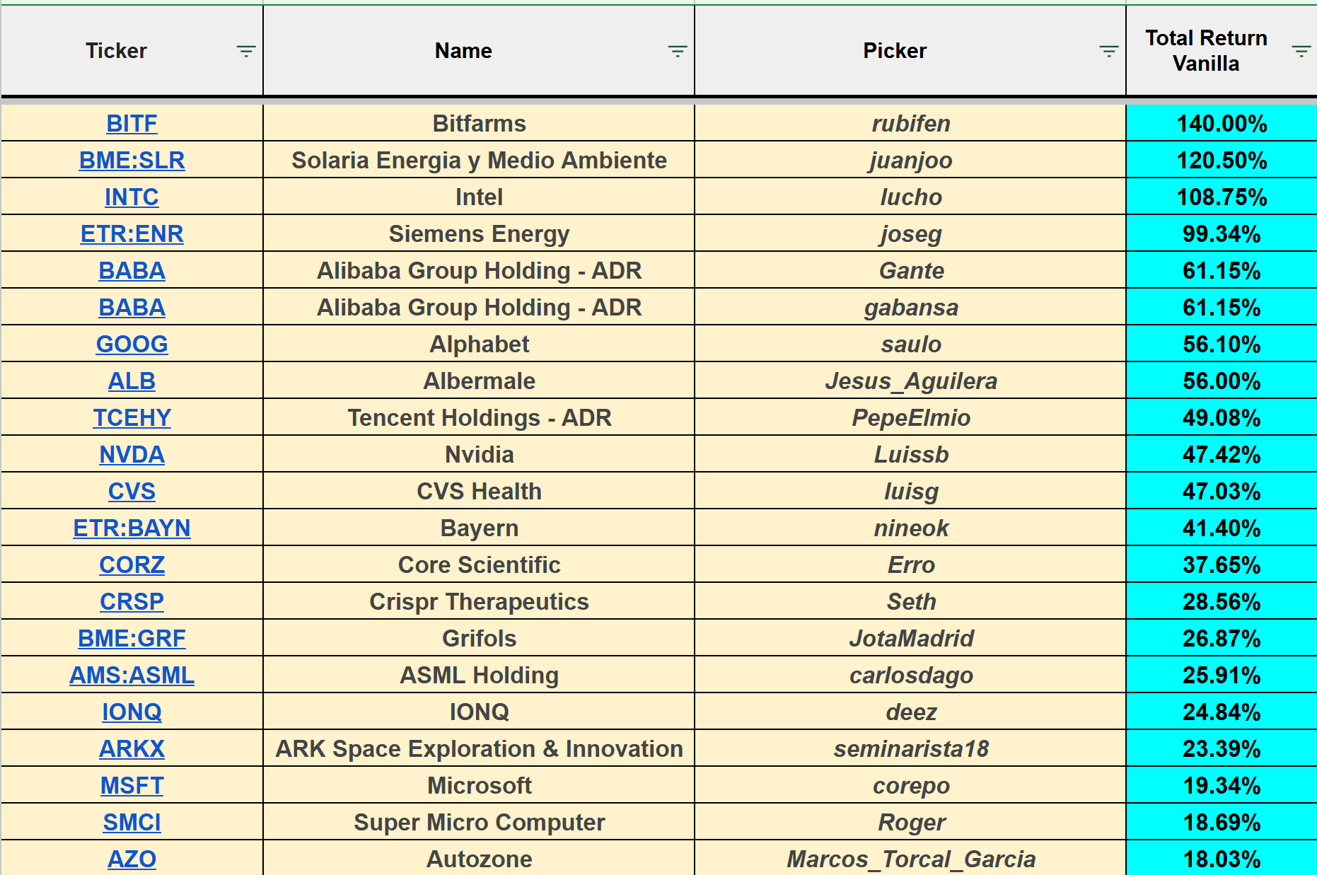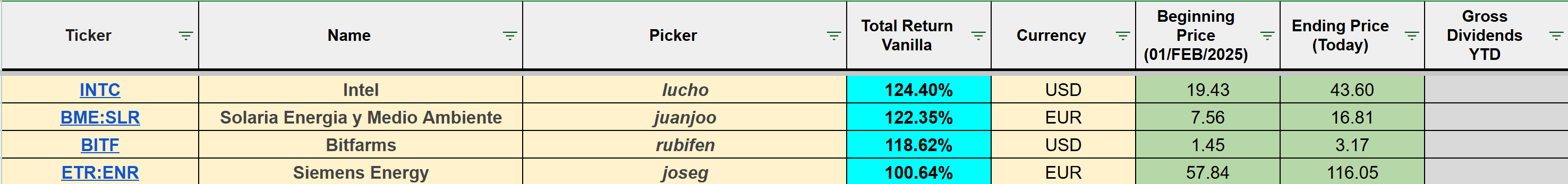 Curiosamente, el primero y el último de la clasificacion actual tienen que ver con Bitcoin. Hace dos meses ya estabais de capa caida pero confieso que le tengo mucha tirria a Saylor … y a Bass ![]()