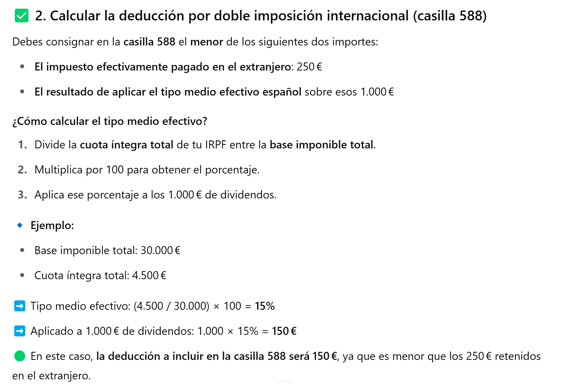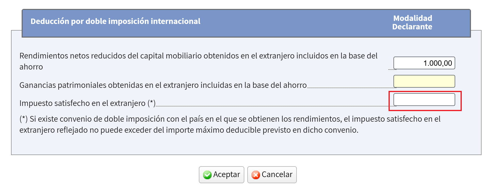 De igual modo tal como ha comentado @corsario en la casilla que dice " Impuesto satisfecho en el extranjero se deberían incluir los impuestos pagados en el extranjero, esto es las consabidas retenciones en origen, pero hasta un máximo del 15% que es lo contemplado en los tratados de doble imposición que España tiene concertados con los distintos países.