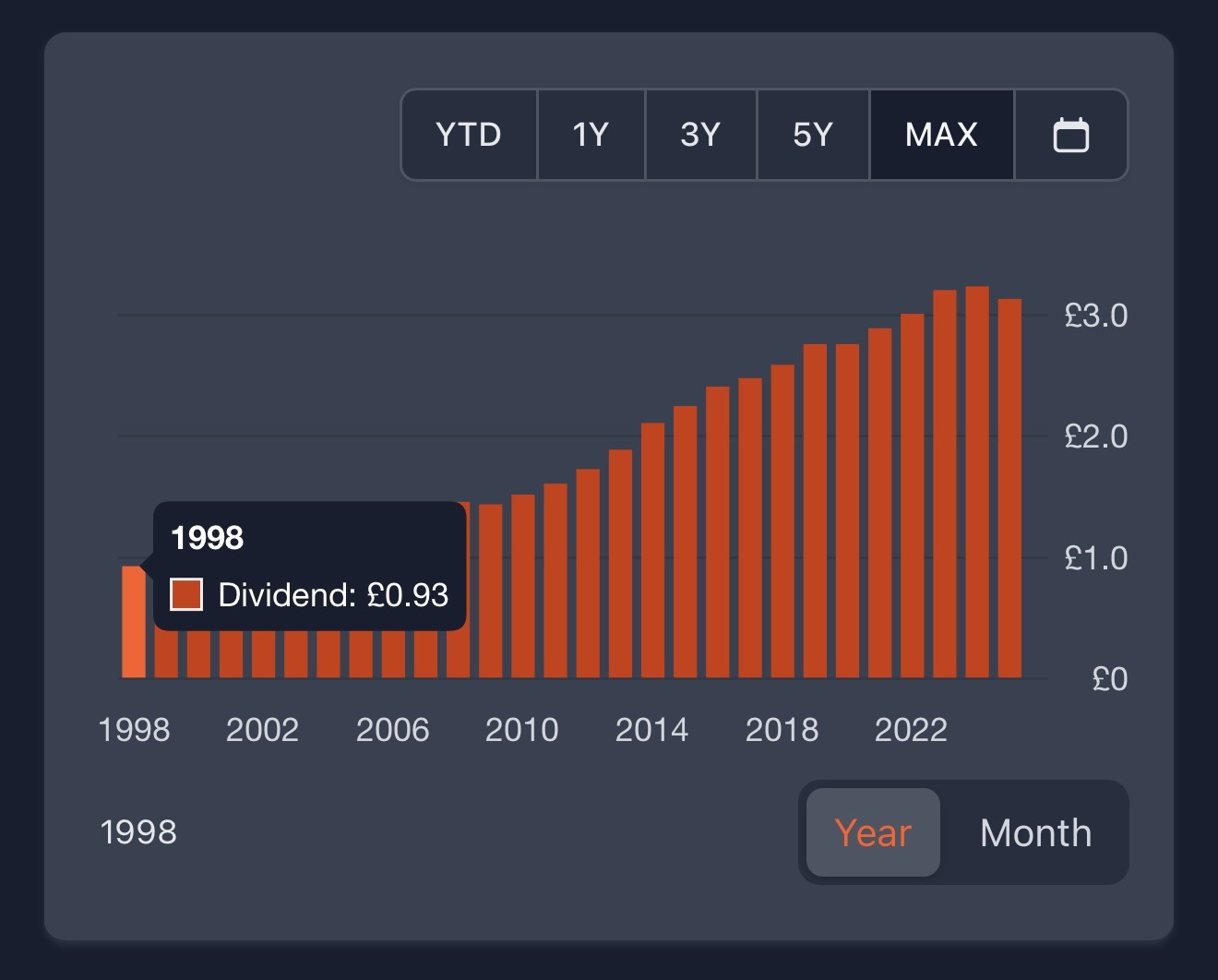 Es lo que te iba a decir, el de Telefónica es aproximadamente al revés: cuando compré mis primeras acciones (allá por 2011) llegó a pagar 1,5€, y después de varios recortes, anulaciones temporales, etc… en 2026 pagará 0,15€ (ejemplo de DDI: decreasing dividend investing