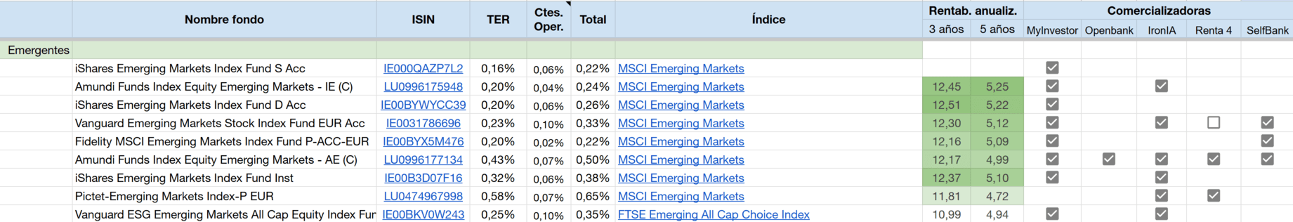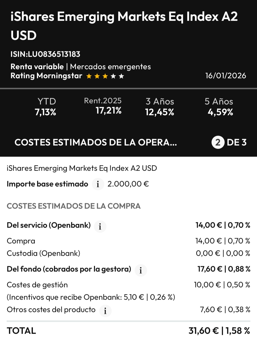 Buenas, estoy revisando fondos para meter algo de dinerillo. Tengo Openbank y estoy revisando la letra pequeña… acabo de hacer la simulación para meter 2000€ y lo que se marcaba como una comisión solo de gestión de 0,5% al inicio de contratar ya se va al 1,58%. Este es para Emerging market de ishares. mi duda es si ese 1,58% es todos los años o solo para la compra-venta y de forma anual solo cobran la comisión de gestión?? Un fondo de este estilo en myinvestor qué comisión se llevan total?