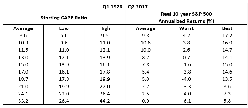 El CAPE del SP500 es a día de hoy 40, la ultima línea de esa tabla. El retorno hisórico del SP500 con este nivel de CAPE en los siguientes 10 años ha sido de entre el -6.1% anual y el +5.8% anual, de media un +0.9%. Y el MSCI World lleva más de un 70% de USA.