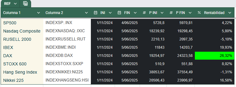 | Columna 1 | Ticker | Fecha compra | Fecha cálculo | Precio Inicial | Precio Actual | Rentabilidad |