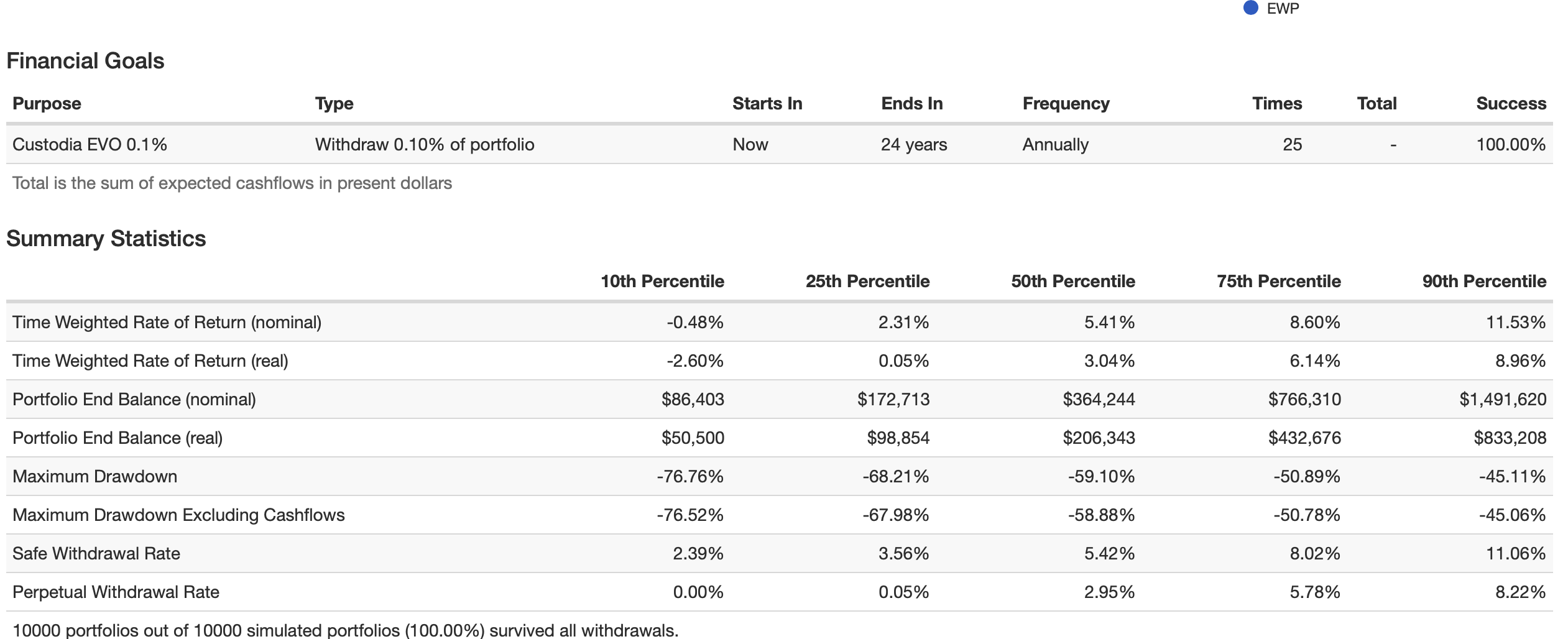 Con una quita de 0.1% anual, invertido en “iShares MSCI Spain ETF” (EWP) durante 25 años te quedarían 206,343 ajustado por inflación (mirando el 50% que presenta el simulador)