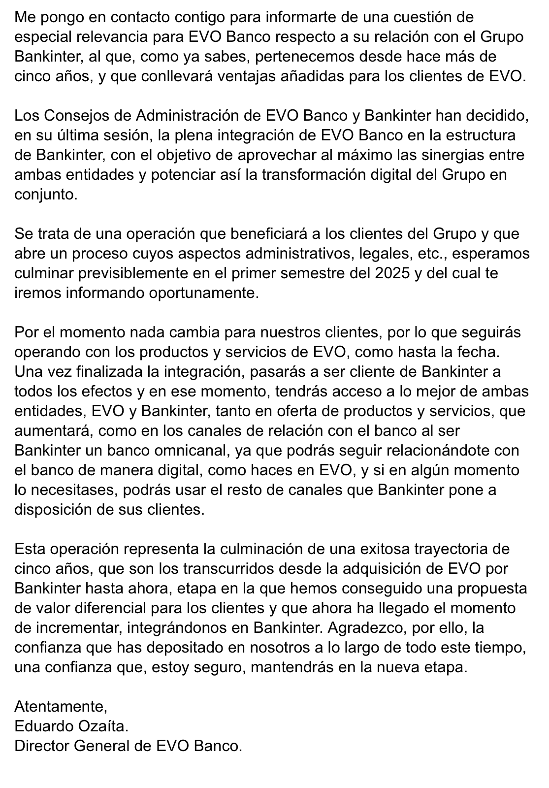 Buenas tardes! ¿Alguien sabe cuanto cobra Evo por traspasar acciones a otra entidad? Serían acciones de EEBB. De momento estoy quieto pero hay que estar alerta para ver como quedarán las nuevas tarifas cuando sea absorvida por Bankinter.