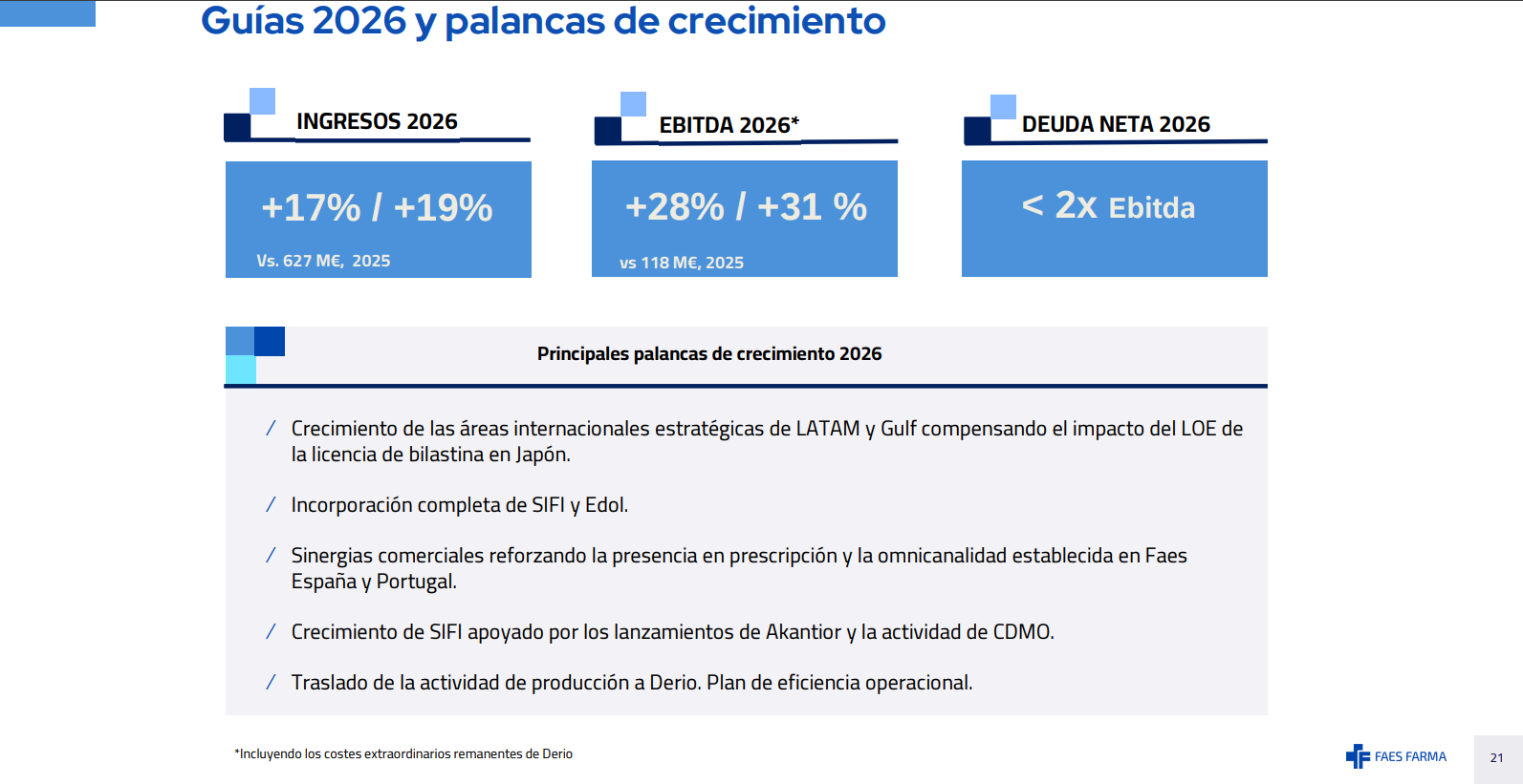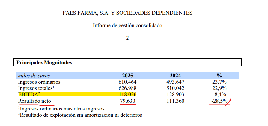 Recorte del complementario de FAES Farma a 0,087 céntimos. Bajada del dividendo total a cargo de 2025 del 28,5% con respecto al dividendo a cargo de 2024. Se mantiene el payout en el 50% (aprox.), la bajada es debida a la bajada equivalente del beneficio neto, afectada por la duplicidad de costes de la planta de Derio hasta que se complete el traslado de la producción, mayores amortizaciones y las adquisiciones que ha ido haciendo.