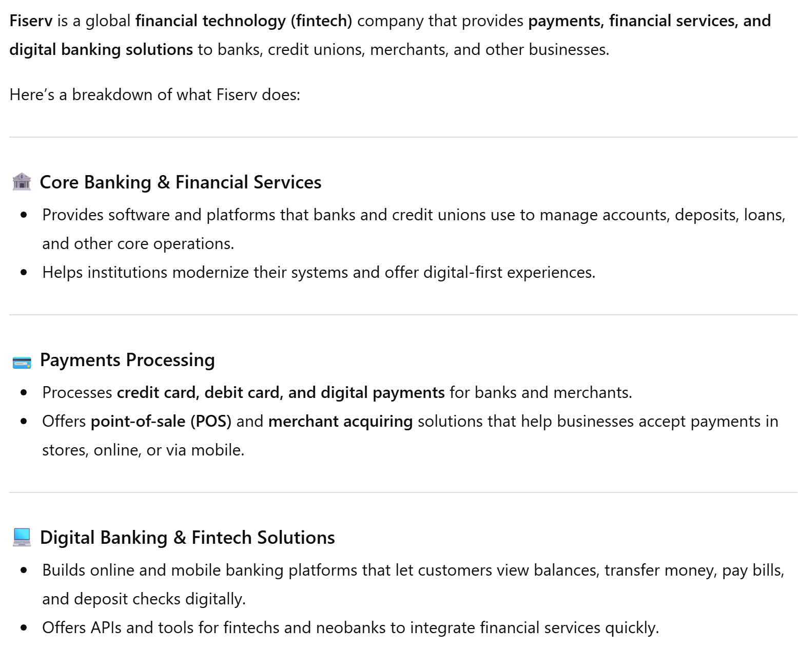 - Since it was built through acquisitions, Fiserv has to maintain multiple core processing platforms, which could limit margins and hamper the quality of its offerings.
