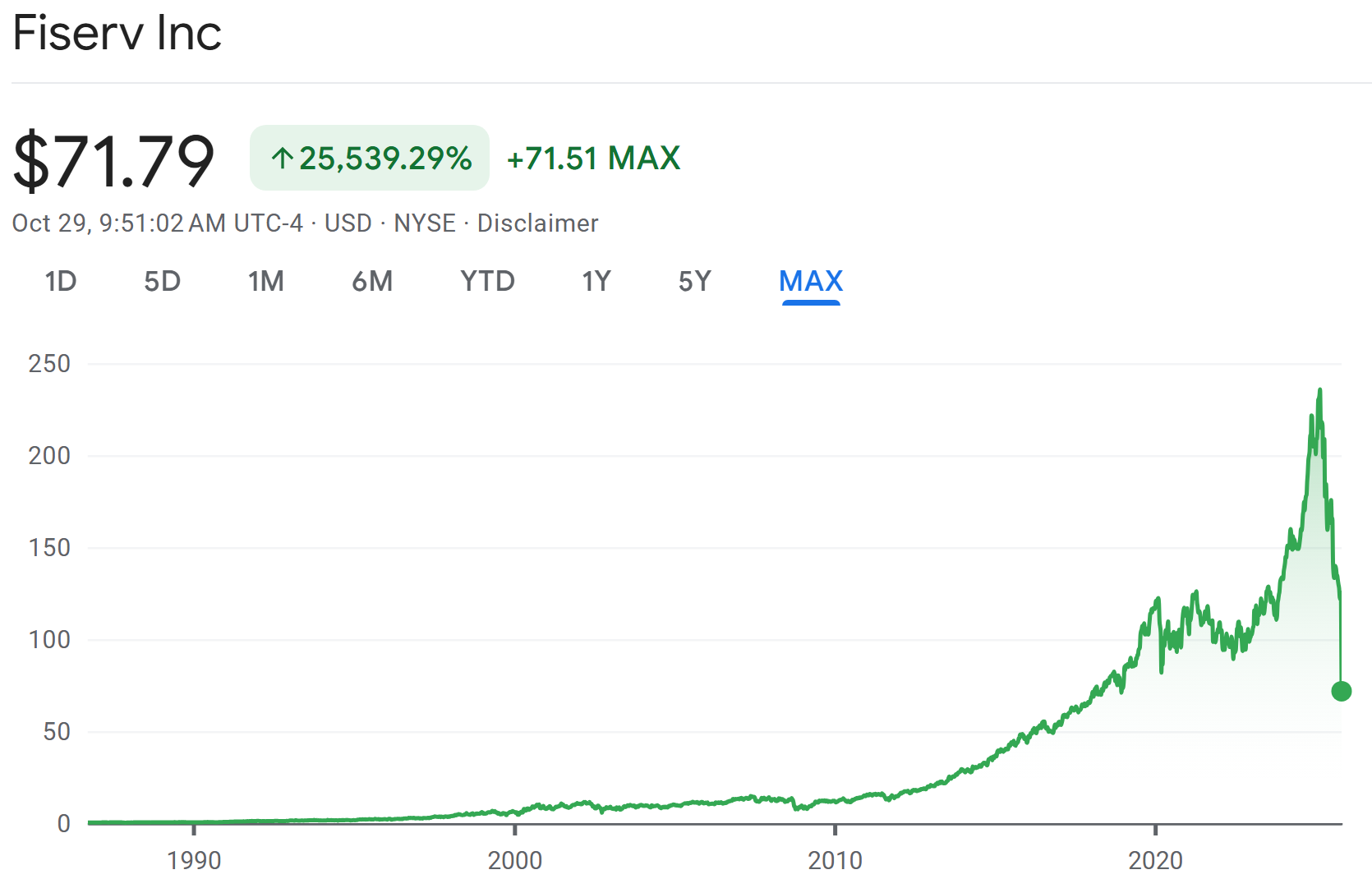 Fiserv’s third-quarter numbers were weak and management pointed to a much more difficult future, sending the shares into a spiral on Oct. 29.