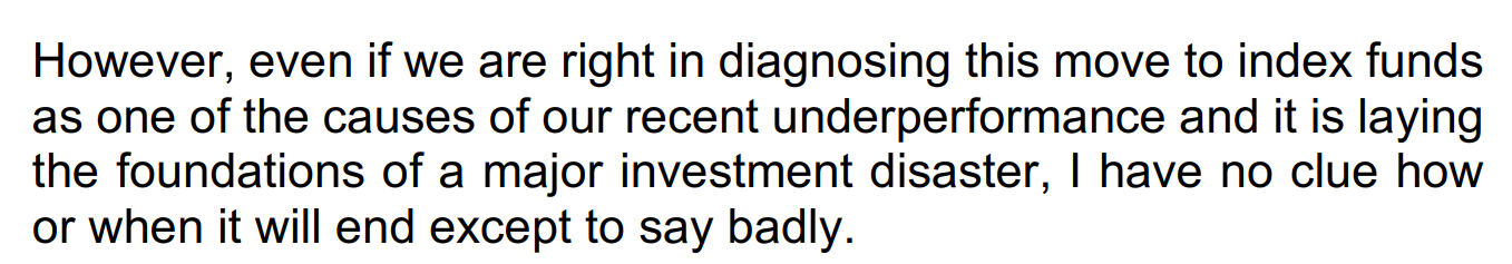 Terry Smith destaca un punto clave para los próximos años: mientras persistan estos flujos, el rendimiento superior de las principales empresas del índice puede superar con creces lo que justificarían los fundamentos. De cara al futuro, admite que no tiene ni idea de cuándo se revertirá este mecanismo, más allá de la creencia de que terminará mal, como todos los períodos de distorsión extrema del capital.