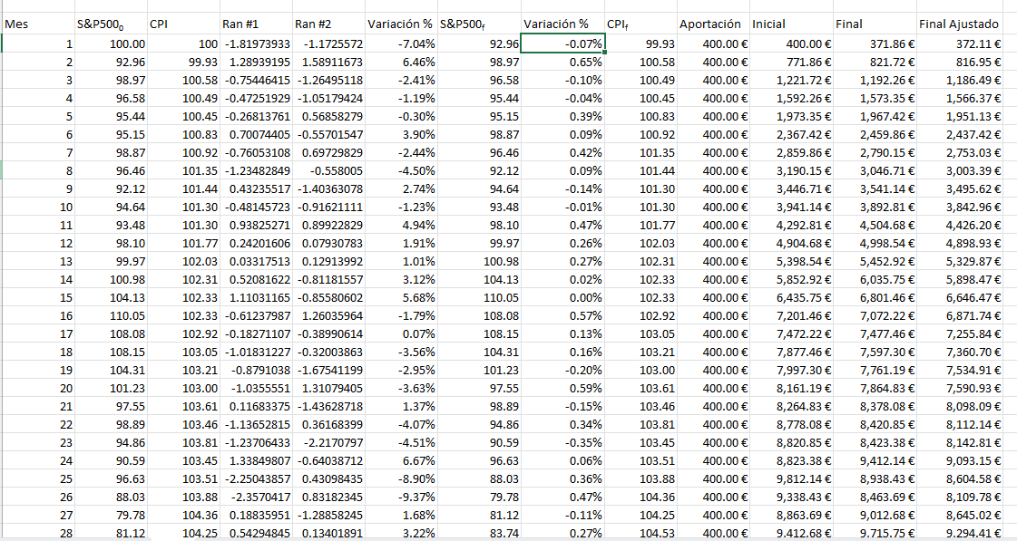 Ahora que ya sabemos calcular la variación mensual de los activos los simulamos. Una columa será el tiempo en meses. Y en las siguientes calculamos la variación de nuestros activos, las aportaciones o lo que queramos. A modo de ejemplo, en la siguiente imagen se hace la simulación de 40 años aportando 400 euros al mes teniendo en cuenta la inflación: