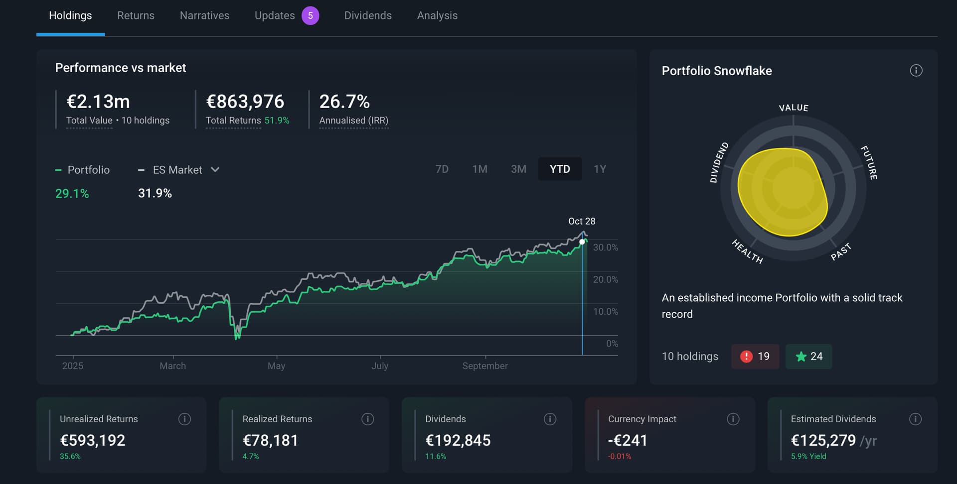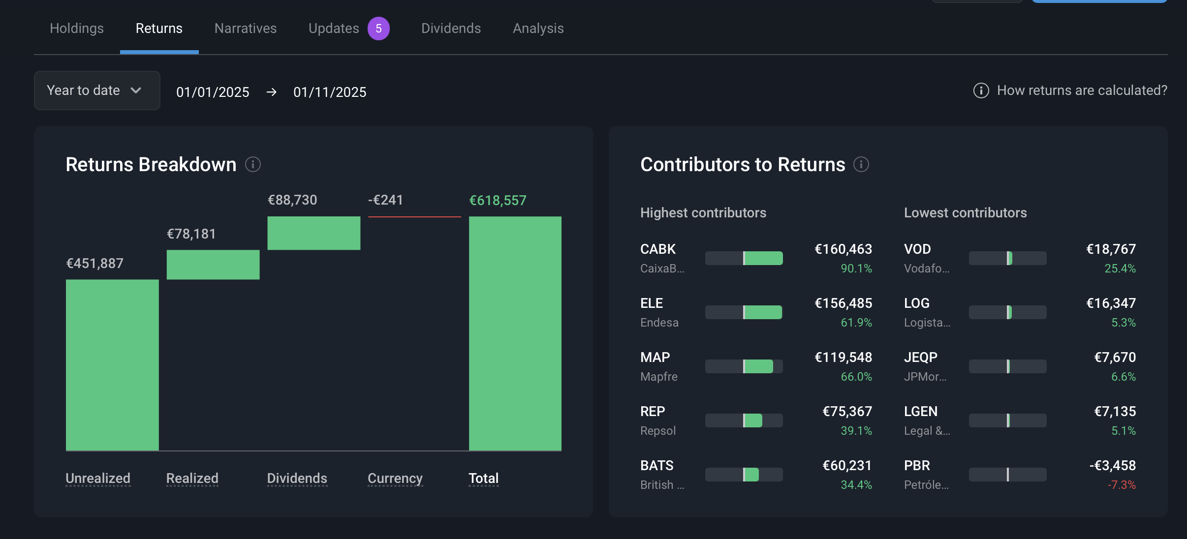Lo cierto es que el retorno acumulado de este año es brutal (casi 704k) entre no realizado, realizado y dividendos y el IRR de los dos años que lleva viva esta cartera es casi del 28%.