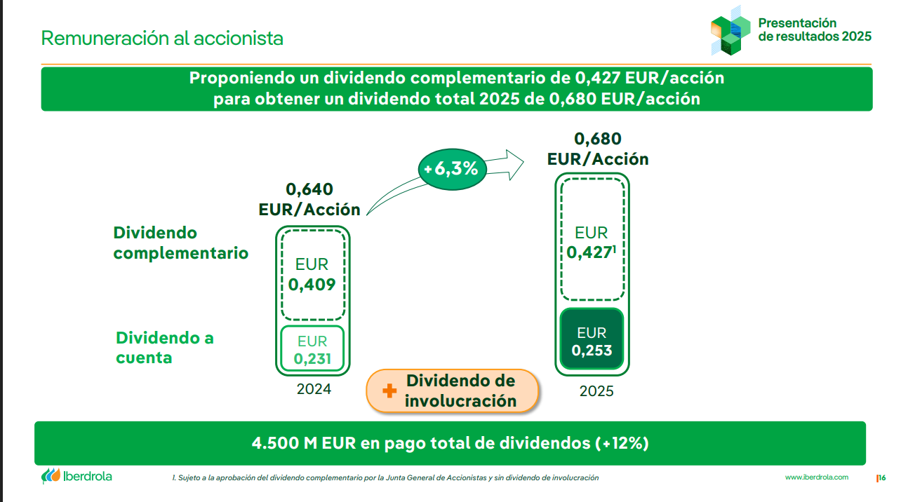 Iberdrola BME: IBE Se propone un dividendo complementario de 0,427 euros por acción, pendiente de ser aprobado en la Junta General de Accionistas que, junto con el dividendo a cuenta de 0,253 euros por acción, representa un dividendo total de 0,680 euros por acción con cargo a los resultados de 2025. Esto representa un crecimiento del 6,3% desde los 0,640 euros por acción en 2024, en línea con el crecimiento del beneficio por acción.