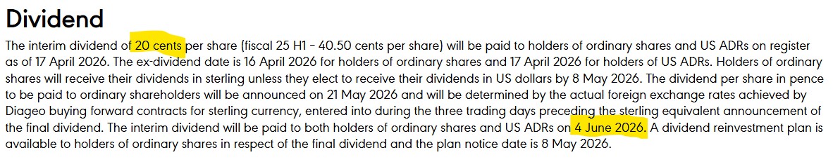 Diageo, $DGE.L, anuncia hoy que pagará su dividendo a cuenta de 2026 el próximo 4 de junio, y que será de 0,20$/acc., lo que supone una reducción del 50,62% respecto a los 0,405$ que pagó como dividendo a cuenta de 2025. El importe en peniques se anunciará el día 21 de mayo de 2026.