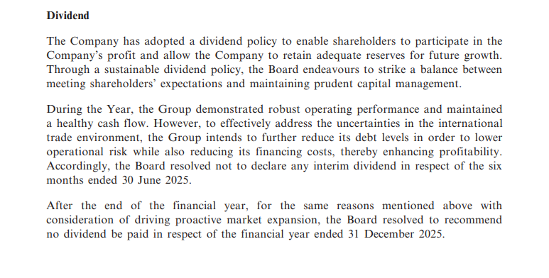 Texhong International Group Ltd HKG: 2678 anuncia que tampoco pagará dividendo final ante la incertidumbre comercial existente y con el objetivo de reducir aún más su deuda.