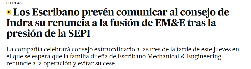 El gobierno de repente ha caído en la cuenta que podría existir un conflicto de intereses con la compra de EM&E por parte de Indra, por lo que sea…al estilo Capitán Renault en Casablanca.